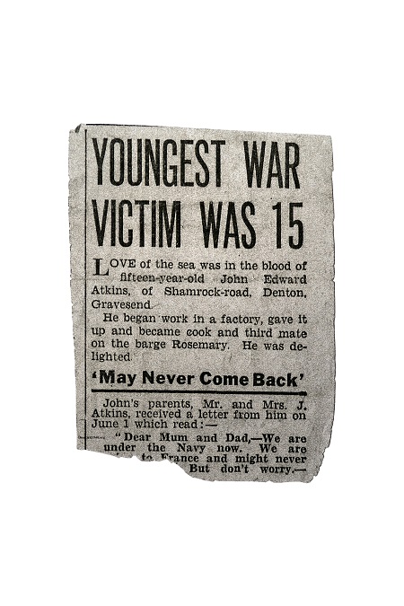 John Atkins’s body was never found, and he is commemorated on the Tower Hill Memorial, London. He is remembered as a member of the Merchant Navy as Ordinary Seaman John Edward Atkins, aged 15 years of age. His date of death is recorded as 1 June 1940. John’s name is listed on panel 63 and is one of the 36.050 names of those from the Merchant Navy that were killed in both the First and Second World War and have no known grave.